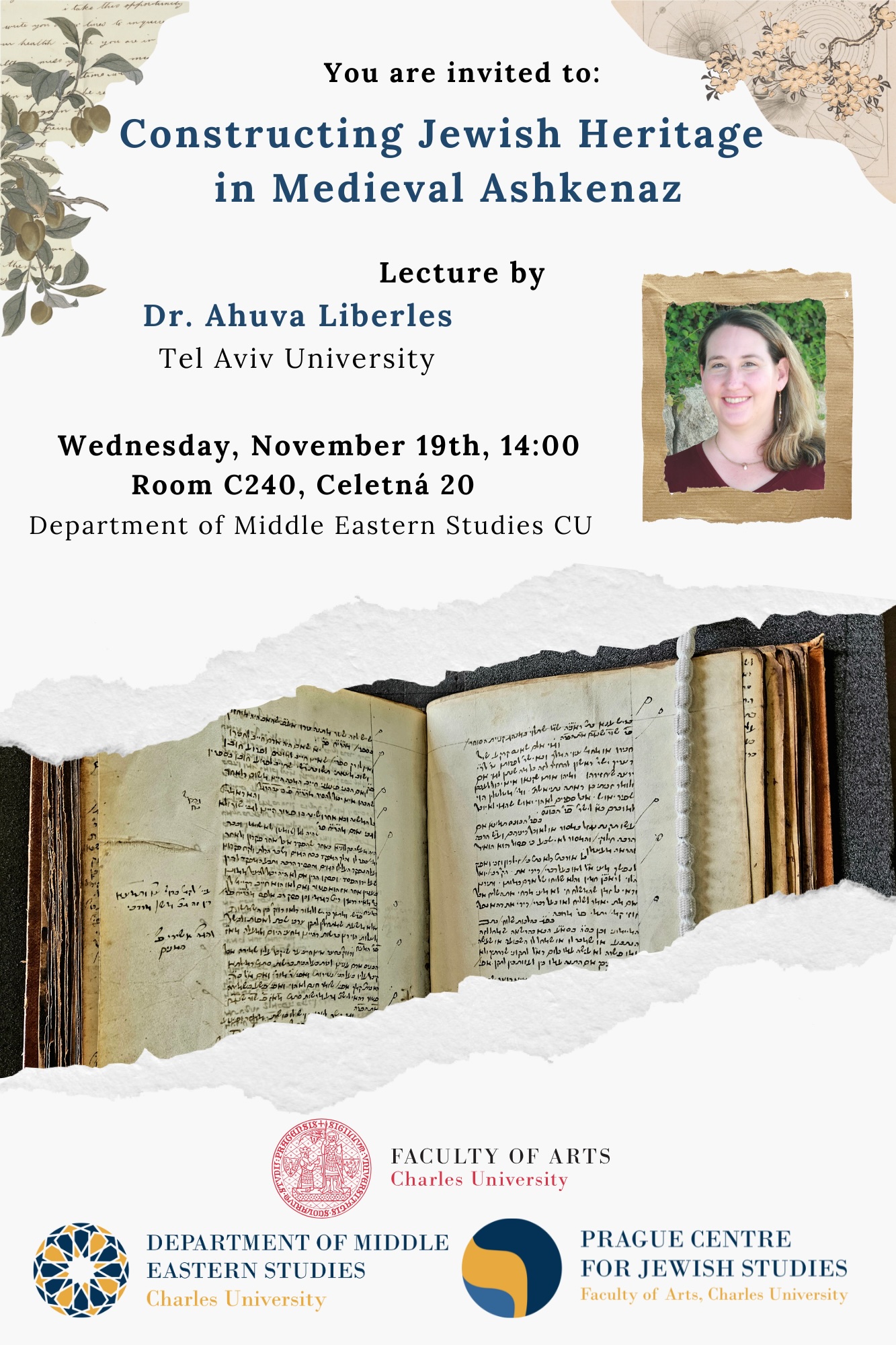 Pražské centrum židovských studií FF UK srdečně zve na přednášku dr. Ahuvy Liberles z Telavivské univerzity. Ahuva Liberles je odbornicí na náboženský život židovských komunit v pozdním středověku. Ve své disertaci, obhájené na Hebrejské univerzitě v Jeruzalémě, se zabývala židovskou konverzí ve středoevropském prostoru. Absolvovala postdoktorské pobyty na LMU v Mnichově a Yaleově univerzitě v USA. Aktuálně působí na Katedře židovských dějin TAU. Její přednáška se zaměří na roli recepce středověké sbírky exempel Sefer chasidim při utváření židovské identity.